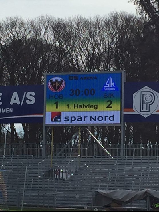 Vi fik en kanon start på kampen, og der var overraskende flot fodbold på banen, selvom den var lidt overfyldt i forhold til vanligt. Efter kort tid kom vi foran 1-0 på et kanon mål af SIK legenden, Lars Nørskov. Der var først en tunnel på Hobro’s højrekant af Lasse Bek, så blev deres højreback snydt i flot sammenspil mellem Nicolaj Dahl og Mads Troelsen, og så kom der et giftigt indlæg fra vores venstre angriber og en kanon afslutning med hovedet af Nørskov. Efter ca 15 min spil, erobrer vi bolden højt på banen og får sat vores højrekant i scene og alene med målmanden banker Thamer den ind til 2-0.